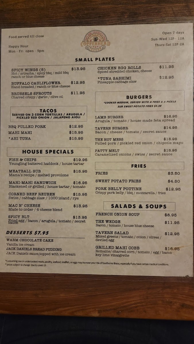 Don’t forget to save room for dessert—Jack Daniels Bread Pudding and a Warm Chocolate Brownie await to end your meal on a sweet note. With attentive service and beautiful surroundings, Copperhead Tavern invites you to create unforgettable dining moments.